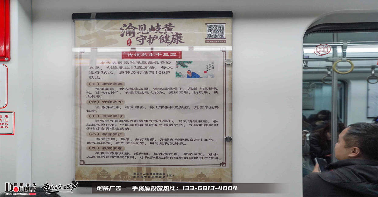 重庆中医药文化品牌专列,正以“润物细无声”的方式,将养生智慧融入市民日常,也将健康商机铺展于轨道之上。品牌专列不是简单的“移动广告牌”,而是一个以时间为友、以空间为媒、以内容为桥的高浓度沟通场域。在重庆这座日均客流超500万的轨道城市,选择品牌专列,就是选择让品牌在千万市民的日常通勤中,被认真阅读、被用心感知、被长久铭记。这,才是真正的“有效曝光”。。无论是推广地域文化、彰显企业社会责任,还是塑造高端品牌形象,品牌专列都能提供无可比拟的深度、广度与温度。